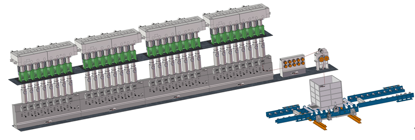 上装式高产能大型圆形组件,密闭式环吹装置、新型上油环和高精度风量自动控制;伺服驱动辊筒式往复装置、铺丝轨迹创新设计,落桶时间近零偏差;一水一汽牵伸工艺,卷曲辊宽度600mm,一宽二窄叠丝方式,牵伸辊长度1500mm,解决装备制造和运行操作难题;四段式紧张热定型机,20只夹套式定型辊,蒸汽串联闪蒸,传热块、热效率高。